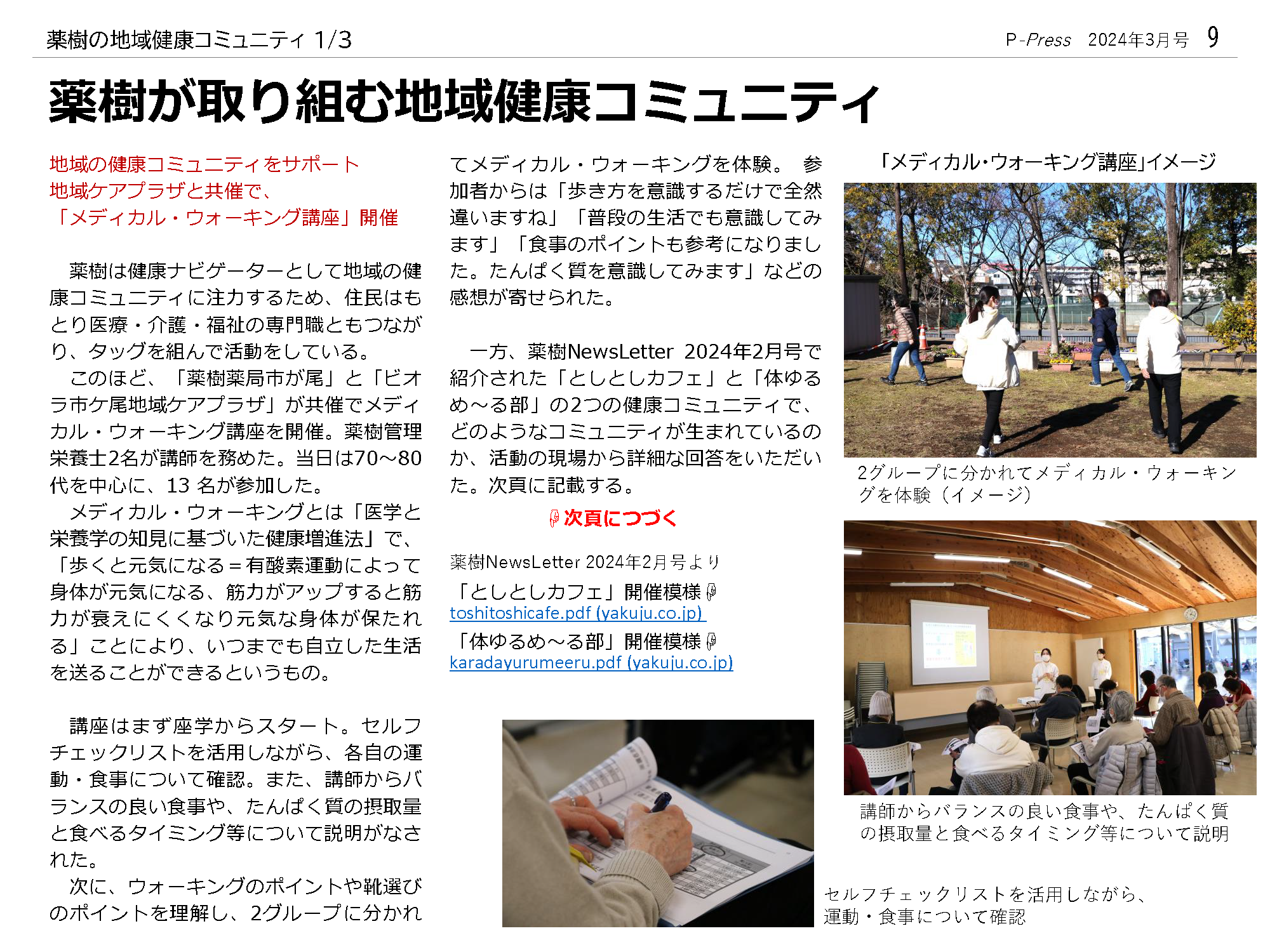 薬局と企業と多職種を結ぶメディア「P-Press」に、薬樹薬局市が尾が地域ケアプラザと共催で開催した「メディカル・ウォーキング講座」に関する記事が掲載されました。
