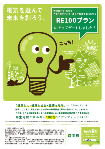 2025年7月より、薬樹グループは電力小売会社/みんな電力(株式会社UPDATER)との契約を、CO2排出ゼロの再生可能エネルギー100%の供給を受ける「RE100プラン」にアップデートしました。このプランは国際イニシアチブに対応しています。