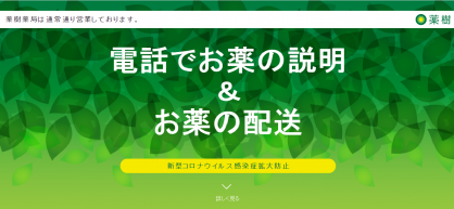 薬樹の薬局では、厚労省の新型コロナウイルス感染防止対策を受け、「電話・FAXによる処方せん受付・服薬指導、薬のご自宅への配送」を行っております。(対策期間中の限定対応)